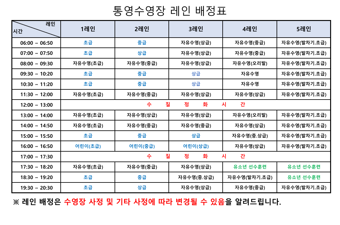 통영수영장 레인 배정표를 안내드리오니 이용에 불편함이 없으시길 바랍니다.