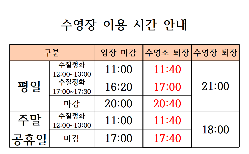 통영수영장 이용시간을 안내드리오니 이용에 불편함이 없으시길 바랍니다.